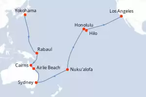 Reiseroute : Yokohama, Rabaul, Cairns, Airlie Beach , Sydney, Nuku'alofa, Datumsgrenze, Honolulu, Hilo, Los Angeles