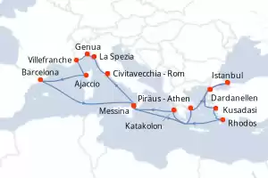 Reiseroute : Civitavecchia - Rom, La Spezia, Genua, Villefranche, Ajaccio, Barcelona, Messina, Piräus - Athen, Dardanellen, Istanbul, Dardanellen, Kusadasi, Rhodos, Katakolon, Messina, Civitavecchia - Rom