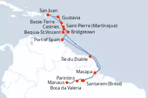 Reiseroute : San Juan, Gustavia, Saint-Pierre (Martinique), Bridgetown, Port of Spain, Macapa, Santarem, Boca da Valeria, Manaus, Parintins, Alter do Chao, Macapa, Île du Diable, Bequia-St.Vincent, Bridgetown, Castries, Gustavia, Basse-Terre, San Juan