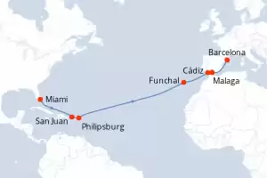 Reiseroute : Miami, San Juan, Philipsburg, Funchal, Cádiz, Malaga, Barcelona