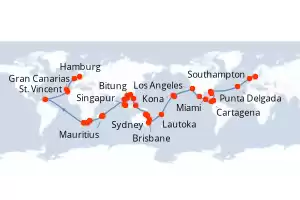 Reiseroute : Hamburg, Southampton, Punta Delgada, Port Canaveral, Miami, Cartagena, Panamakanal, Puerto Quetzal, Manzanillo, Los Angeles, Kona, Honolulu, Datumsgrenze, Lautoka, Sydney, Brisbane, Airlie Beach , Yorkeys Knob, Bitung, Manille, Hong Kong, Halong Bucht, Chan May, Laem Chabang, Singapur, Hafen Klang, Mauritius, La Réunion, Durban, Port Elisabeth, Kapstadt, St. Vincent, Gran Canarias, Madeira, Southampton, Hamburg
