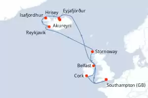 Reiseroute : Southampton, Belfast, Hrisey, Eyjafjordur, Akureyri, Isafjordhur, Reykjavik, Stornoway, Cork, Southampton