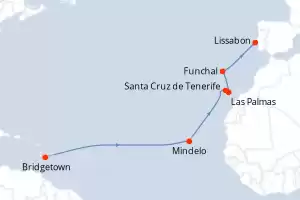 Reiseroute : Bridgetown, Mindelo, Santa Cruz de Tenerife, Las Palmas, Funchal, Lissabon, Bridgetown, Mindelo, Santa Cruz de Tenerife, Las Palmas, Funchal, Lissabon