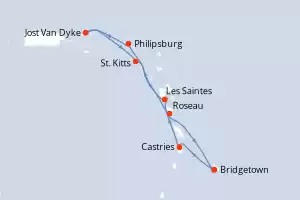 Reiseroute : Bridgetown, Castries, Les Saintes, Philipsburg, Jost Van Dyke, St. Kitts, Roseau, Bridgetown, Castries, Les Saintes, Philipsburg, Jost Van Dyke, St. Kitts, Roseau, Bridgetown