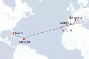 Reiseroute : Barcelona, Malaga, Funchal, San Juan, Miami