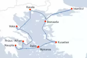 Reiseroute : Piräus - Athen, Nauplia, Mykonos, Delos, Mykonos, Kusadasi, Bozcaada, Istanbul, Kavala, Volos, Piräus - Athen