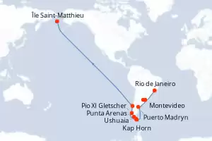 Reiseroute : Rio de Janeiro, Montevideo, Buenos Aires, Puerto Madryn, Kap Horn, Ushuaia, Punta Arenas, Pio XI Gletscher, Puerto Montt, Île Saint-Matthieu