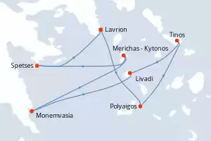 Reiseroute : Lavrion, Tinos, Polyaigos, Livadi, Monemvasia, Merichas - Kytonos, Spetses, Lavrion