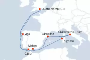 Reiseroute : Southampton, Vigo, Barcelona, Civitavecchia - Rom, Alghero, Malaga, Cádiz, Southampton