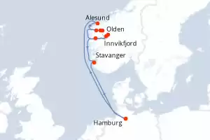 Reiseroute : Hamburg, Bergen, Olden, Innvikfjorden, Nordfjord, Alesund, Hamburg