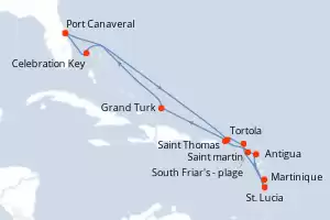 Reiseroute : Port Canaveral, Celebration Key, Tortola, Saint martin, Martinique, St. Lucia, Antigua, South Friar's - plage, Saint Thomas, Grand Turk, Port Canaveral