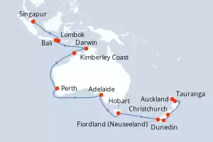 Reiseroute : Auckland, Tauranga, Christchurch, Dunedin, Fjordland, Hobart, Adelaide, Perth, Kimberley Coast, Darwin, Bali, Lombok, Singapur