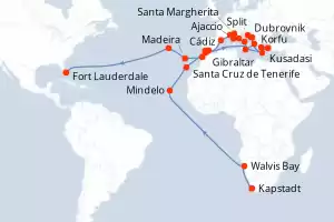 Reiseroute : Kapstadt, Walvis Bay, Mindelo, Santa Cruz de Tenerife, Gibraltar, Syrakus (Sizilien), Korfu, Dubrovnik, Split, Kotor, Piräus - Athen, Kusadasi, Chania, Salerno, Civitavecchia - Rom, Ajaccio, Santa Margherita, Cannes, Barcelona, Malaga, Cádiz, Tanger, Casablanca, Madeira, Punta Delgada, Fort Lauderdale