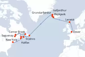 Reiseroute : Dover, Lerwick, Reykjavik, Grundarfjordur, Isafjordhur, St Johns, Corner Brook, Québec City, Saguenay, Charlottetown, Sydney, Halifax, New York