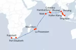 Reiseroute : Singapur, Hafen Klang, Penang, Phuket, Hambantota, Colombo, Male, Mauritius, La Possession, Port Elisabeth, Kapstadt