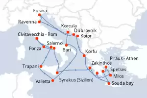 Reiseroute : Civitavecchia - Rom, Ponza, Salerno, Syrakus (Sizilien), Zakinthos, Souda bay, Spetses, Piräus - Athen, Milos, Kalamata, Korfu, Kotor, Dubrovnik, Fusina, Ravenna, Korcula, Bari, Valletta, Trapani, Neapel, Civitavecchia - Rom