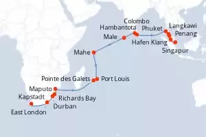 Reiseroute : Singapur, Hafen Klang, Penang, Langkawi, Phuket, Hambantota, Colombo, Male, Mahe, Port Louis, Pointe des Galets, Maputo, Richards Bay, Durban, East London, Kapstadt