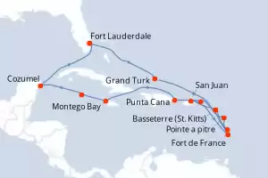 Reiseroute : Fort Lauderdale, Grand Turk, Pointe a pitre, Fort de France, Basseterre (St Kitts), San Juan, Marigot Bay, Basseterre (St Kitts), Jost Van Dyke, Punta Cana, Montego Bay, Grand Cayman, Cozumel, Fort Lauderdale