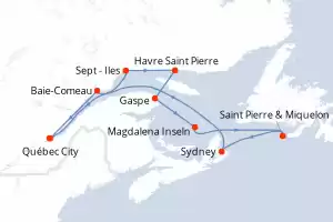 Reiseroute : Québec City, Sept - Iles, Havre Saint Pierre, Gaspe, Magdalena Inseln, Saint Pierre & Miquelon, Sydney, Baie-Comeau, Québec City