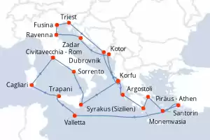 Reiseroute : Civitavecchia - Rom, Sorrento, Syrakus (Sizilien), Korfu, Kotor, Zadar, Ravenna, Fusina, Triest, Dubrovnik, Korfu, Argostoli, Monemvasia, Piräus - Athen, Santorin, Bodrum, Valletta, Trapani, Cagliari, Civitavecchia - Rom