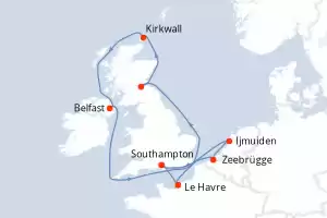Reiseroute : Southampton, Le Havre, Edinburgh, Kirkwall, Belfast, Dun Laoghaire, Ijmuiden, Zeebrügge, Southampton