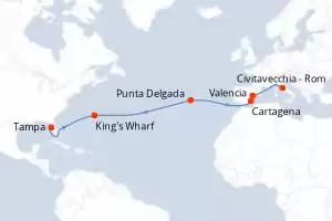 Reiseroute : Civitavecchia - Rom, Valencia, Cartagena, Punta Delgada, King's Wharf, Tampa