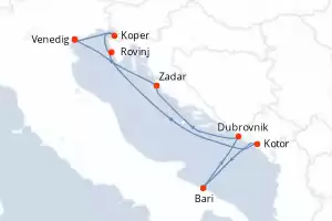 Reiseroute : Venedig, Triest, Rovinj, Kotor, Bari, Dubrovnik, Hvar, Zadar, Venedig, Triest, Rovinj, Kotor, Bari, Dubrovnik, Hvar, Zadar, Venedig