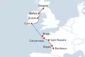 Reiseroute : Glasgow, Belfast, Dublin, Cork, Brest, Concarneau, Saint Nazaire, Royan, Bordeaux