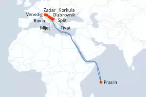 Reiseroute : Venedig, Rovinj, Zadar, Praslin, Split, Hvar, Korkula, Mljet, Tivat, Dubrovnik