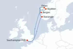 Reiseroute : Southampton, Stavanger, Olden, Skjolden, Bergen, Southampton