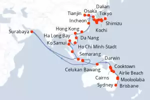 Reiseroute : Tokyo, Shimizu, Osaka, Kochi, Hiroshima, kitakyushu, Hakata, Kagoshima, Nagasaki, Yeosu, Incheon, Tianjin, Dalian, Shanghai, Hong Kong, Ha Long Bay, Da Nang, Ho Chi Minh-Stadt, Laem Chabang, Ko Samui, Singapur, Semarang, Surabaya, Celukan Bawang, Benoa, Darwin, Cooktown, Cairns, Townsville, Airlie Beach , Mooloolaba, Brisbane, Sydney