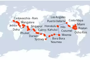 Reiseroute : Miami, Cozumel, Costa Maya, Harvest Caye, Roatan, Grand Cayman, Ocho Rios, Puerto Limon, Cartagena, Panama City, Puntarenas, Acajutla, Puerto Quetzal, Puerto Vallarta, Cabo San Lucas, Los Angeles, Honolulu, Kahului, Hilo, Bora Bora, Moorea, Papeete, Moorea, Huahine, Raiatea, Bora Bora, Pago Pago, Apia, Suva, Lautoka, Mystery Island, Lifou, Noumea, Sydney, Townsville, Cairns, Cooktown, Darwin, Komodo, Benoa, Surabaya, Semarang, Singapur, Hafen Klang, Penang, Phuket, Colombo, Male, Kochi, Mangalore, Goa, Mumbai, Muscat, Dubai, Doha, Abu Dhabi, Salaalah, Jedda, Safaga, Aqaba, Haifa, Limassol, Rhodos, Kusadasi, Piräus - Athen, Sorrento, Civitavecchia - Rom