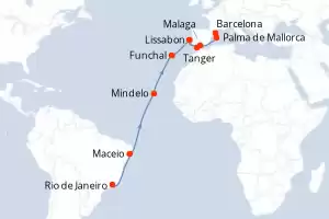 Reiseroute : Santos, Rio de Janeiro, Maceio, Mindelo, Funchal, Lissabon, Tanger, Malaga, Palma de Mallorca, Barcelona