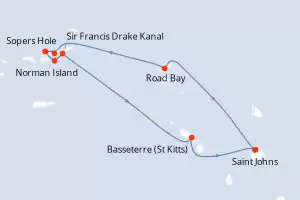 Reiseroute : Saint Johns, Road Bay, Sopers Hole, Jost Van Dyke, Norman Island, Sir Francis Drake Kanal, Basseterre (St Kitts), Saint Johns