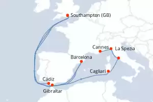 Reiseroute : Southampton, Gibraltar, Cagliari, Civitavecchia - Rom, La Spezia, Cannes, Barcelona, Cádiz, Southampton