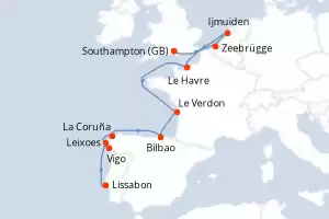 Reiseroute : Southampton, Zeebrügge, Ijmuiden, Le Havre, Le Verdon, Bilbao, La Coruña, Vigo, Leixoes, Lissabon