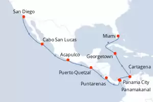 Reiseroute : San Diego, Cabo San Lucas, Acapulco, Puerto Quetzal, Puntarenas, Panama City, Panamakanal, Cartagena, Georgetown, Miami
