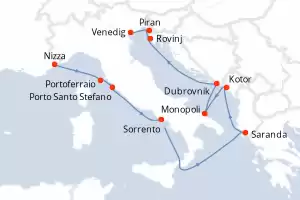 Reiseroute : Nizza, Portoferraio, Porto Santo Stefano, Sorrento, Saranda, Kotor, Monopoli, Dubrovnik, Spetses, Rovinj, Piran, Venedig, Nizza, Portoferraio, Porto Santo Stefano, Sorrento, Saranda, Kotor, Monopoli, Dubrovnik, Spetses, Rovinj, Piran, Venedig