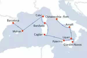 Reiseroute : Civitavecchia - Rom, Amalfi, Lipari, Giardini Naxos, Palermo, Cagliari, Bonifacio, Calvi, Mahon, Barcelona