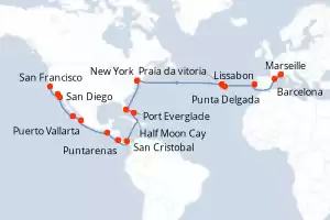Reiseroute : Marseille, Barcelona, Lissabon, Punta Delgada, Praia da vitoria, New York, Port Everglade, Half Moon Cay, San Cristobal, Puntarenas, Puerto Quetzal, Puerto Vallarta, Cabo San Lucas, San Diego, Los Angeles, San Francisco