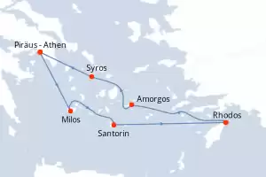 Reiseroute : Piräus - Athen, Milos, Santorin, Rhodos, Amorgos, Syros, Piräus - Athen