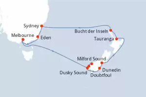 Reiseroute : Sydney, Eden, Melbourne, Dusky Sound, Milford Sound, Doubtfoul, Dunedin, Timaru, Tauranga, Bucht der Inseln, Sydney, Hobart, Sydney