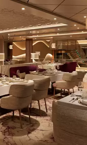 Als großes schwimmendes Resort gestaltet, erstreckt sich die AROYA über mehrere Decks und bietet zahlreiche helle Kabinen und Suiten – viele davon mit Balkon –, die als private Rückzugsorte zwischen den Stopps dienen. Die Gemeinschaftsbereiche sind großzügig gestaltet: Panoramasalons, ein weitläufiges Theater, eine Wasserlandschaft mit Rutschen, Clubs für Kinder und Jugendliche, ein Wellnesscenter sowie umfassende Sporteinrichtungen. Die aufmerksame und stets präsente Crew begleitet dich während der gesamten Reise und sorgt für ein rundum angenehmes Erlebnis. Für alle, die ein Höchstmaß an Exklusivität wünschen, vereint der Khuzama-Bereich Premium-Suiten mit personalisierten Services (Butler-Service, bevorzugtes Boarding, eigenes Restaurant und privater Lounge) – eine zusätzliche Dimension an Eleganz innerhalb des AROYA-Erlebnisses.