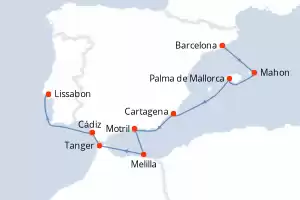 Reiseroute : Barcelona, Mahon, Palma de Mallorca, Cartagena, Motril, Melilla, Tanger, Cádiz, Lissabon