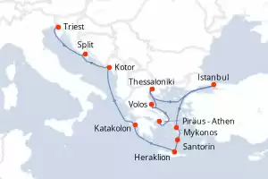 Reiseroute : Piräus - Athen, Volos, Thessaloniki, Istanbul, Mykonos, Santorin, Heraklion, Katakolon, Kotor, Split, Triest