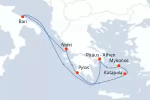Reiseroute : Piräus - Athen, Bari, Nidri, Pylos, Katapola, Mykonos, Piräus - Athen