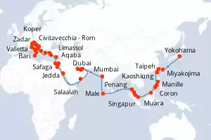 Reiseroute : Yokohama, Miyakojima, Taipeh, Kaoshiung, Manille, Coron, Puerto Princesa, Muara, Singapur, Hafen Klang, Penang, Phuket, Galle, Male, Mumbai, Dubai, Abu Dhabi, Doha, Dubai, Salaalah, Jedda, Safaga, Aqaba, Sharm El Sheikh, Sokhna, Limassol, Rhodos, Ephesus, Piräus - Athen, Igoumenitsa, Bari, Zadar, Koper, Ravenna, Split, Dubrovnik, Valletta, Messina, Sorrento, Civitavecchia - Rom