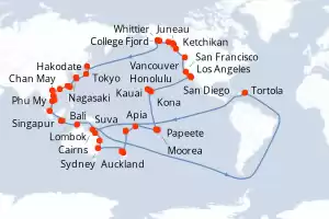 Reiseroute : Auckland, Tauranga, Suva, Dravuni Island, Apia, Papeete, Moorea, Raiatea, Honolulu, Kauai, Kona, Los Angeles, San Diego, San Francisco, Victoria, Vancouver, Ketchikan, Juneau, Skagway, Hubard (Gletscher), College Fjord, Whittier, Kushiro, Hakodate, Tokyo, Kagoshima, Nagasaki, Ishigaki, Taipeh, Hong Kong, Halong Bucht, Chan May, Cami Ranh, Phu My, Singapur, Lombok, Bali, Darwin, Cairns, Tortola, Airelie Beach, Brisbane, Sydney, Auckland