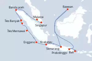 Reiseroute : Singapur, Malacca, Banda aceh, Îles Banyak, Pulau Nias - Sumatra, Îles Mentawaï, Enggano, Krakatau, Semarang, Bawean, Probolinggo, Bali